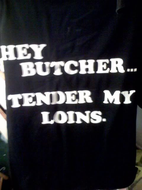 Jack: What's your shirt say? Hey Butcher... Tender my... loins?... !